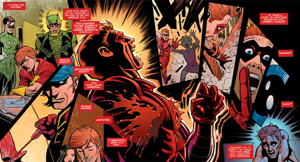 Now just to catch up those less familiar with the ground work here, or for those who may need a reminder, Roy was caught up as a victim in a massive attack against the Justice League which left him maimed and his daughter murdered. This resulted in him acquiring a mechanical arm to replace that which had been lost, and going a bit mental as he relapsed into his drug usage, becoming a drug addled Punisher-esque anti-hero that stood against the Justice League (then lead by Dick Grayson as Batman, and encompassing many former Titans within its ranks). But over the course of the last pre-Flashpoint Titans ongoing, he did eventually find his way back to being a hero, turning on Deathstroke, and teaming with a revived Jericho to bring the Titans name back to something worth respecting in the hero community. Sadly, most of the set up from that final story has been lost here.