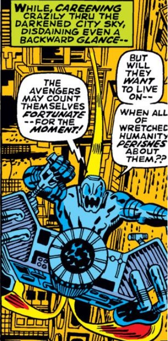 Once the quinjets are free, the Avengers head off for Ultron’s original hideout. However, the Vision is already there and continuing his moody self-loathing and musing about how appropriate it is that he brought Ultron back to life, and now he must destroy him. We get a brief appearance by Dum Dum Dugan and his “Suicide Squad” as they get a reading from the stolen adamantium. Some of them are going to go retrieve the alloy while others will be off to find Nick Fury and capture him (as is seen in the Shield series of the late 60s). Back in Ultron’s lair, Vision watches as Ultron reveals his plan in a monologue. He plans to set off every nuclear device to destroy New York City and leave only himself (since he cannot be destroyed).