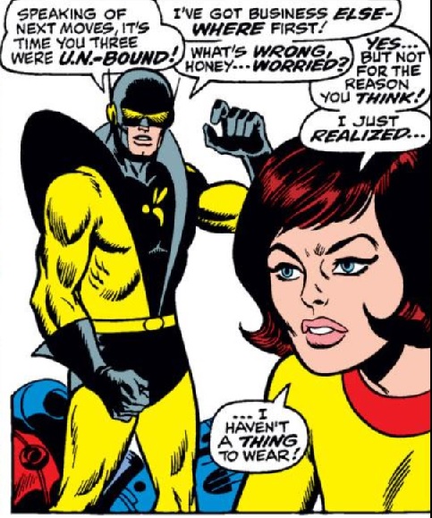Now, I know about the legendary Marvel Method. Sal Buscema drew this panel, and Roy Thomas put in the dialog and what have ya. I can’t help but to think that Thomas looked at this and just didn’t know what else to do. Yes, Jan’s personality was certainly one of a socialite who always dressed well. I mean, jeez, she had a LOT of costume changes through the years. So clothing was her thing. However, here, she’s kind of got this look… It’s like the love child of Dr. Benton Quest and a soulless stare that may confuse some people on whether or not she was alive. So, after seeing the image, and reading the words, we are left with only one thing to think about: Jan’s really, really, REALLY concerned that she hasn’t a thing to wear!