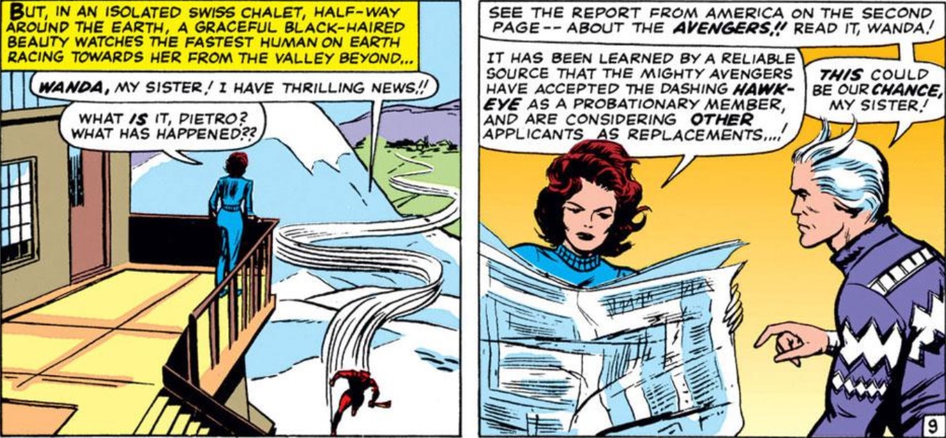 Next the Avengers call Namor and offer him a chance to win respect from the surface world by giving up his dreams of conquest. Namor shoots down the offer despite being honored by the offer. Next up, in an isolated chalet in Switzerland, Quicksilver rushes to his sister, Scarlet Witch, to give her a newspaper discussing the Avengers looking for new members. They see this as their chance to show they are truly heroic and not evil lackeys of Magneto in the Brotherhood of Evil Mutants. So they write a letter to the Avengers to say they wish to join.