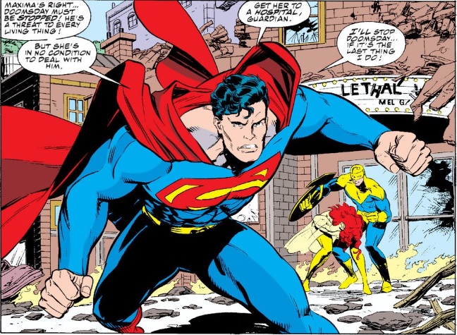 While Guardian attends to the dazed and injured Maxima, Superman reveals he’s never faced anything like Doomsday before. Superman tells Guardian to get her to the hospital while he foreshadows his own fate by exclaiming he’ll stop Doomsday even if it’s the last thing he does. He takes off to follow Doomsday’s trail of disaster all the while wondering where the monster might have come from. (SPOILERS: Krypton)