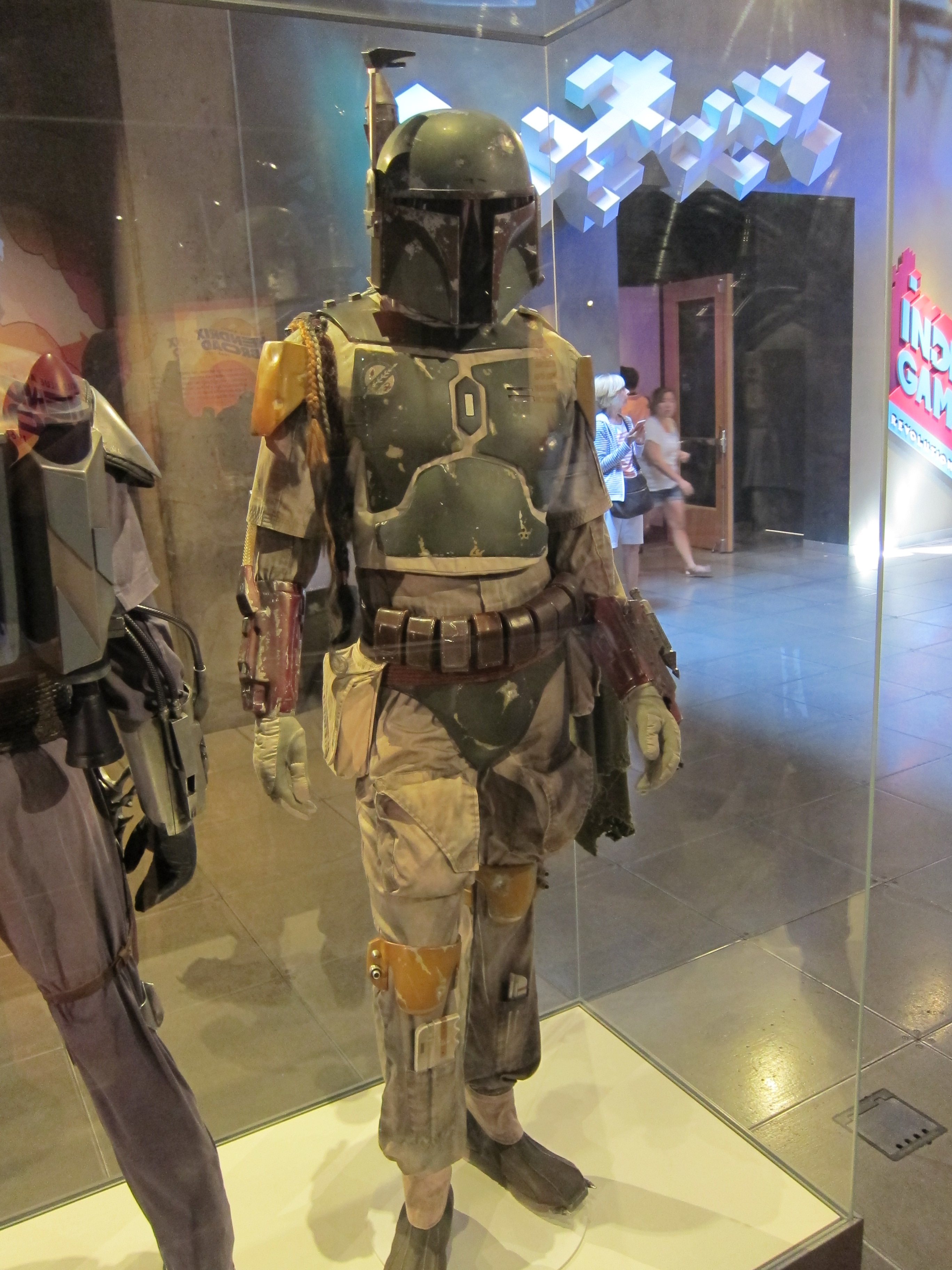 When I was there, I was also very fortunate to see two different traveling exhibits. One featured costumes and some props from the Star Wars movies. If you’re a fan of those at all (I certainly am), this was amazing to see. Han’s costume, Chewie next to him. Ben’s robes. Vader’s armor, stormtroopers, and of course, the infamous Leia bikini outfit. C-3P0 and R2 were there as well. Aside from the many costumes were panels about the design and look of the moves in general and some of the characters. Elsewhere, off by itself, was the armor of the most famous of the bounty hunters, Boba Fett.