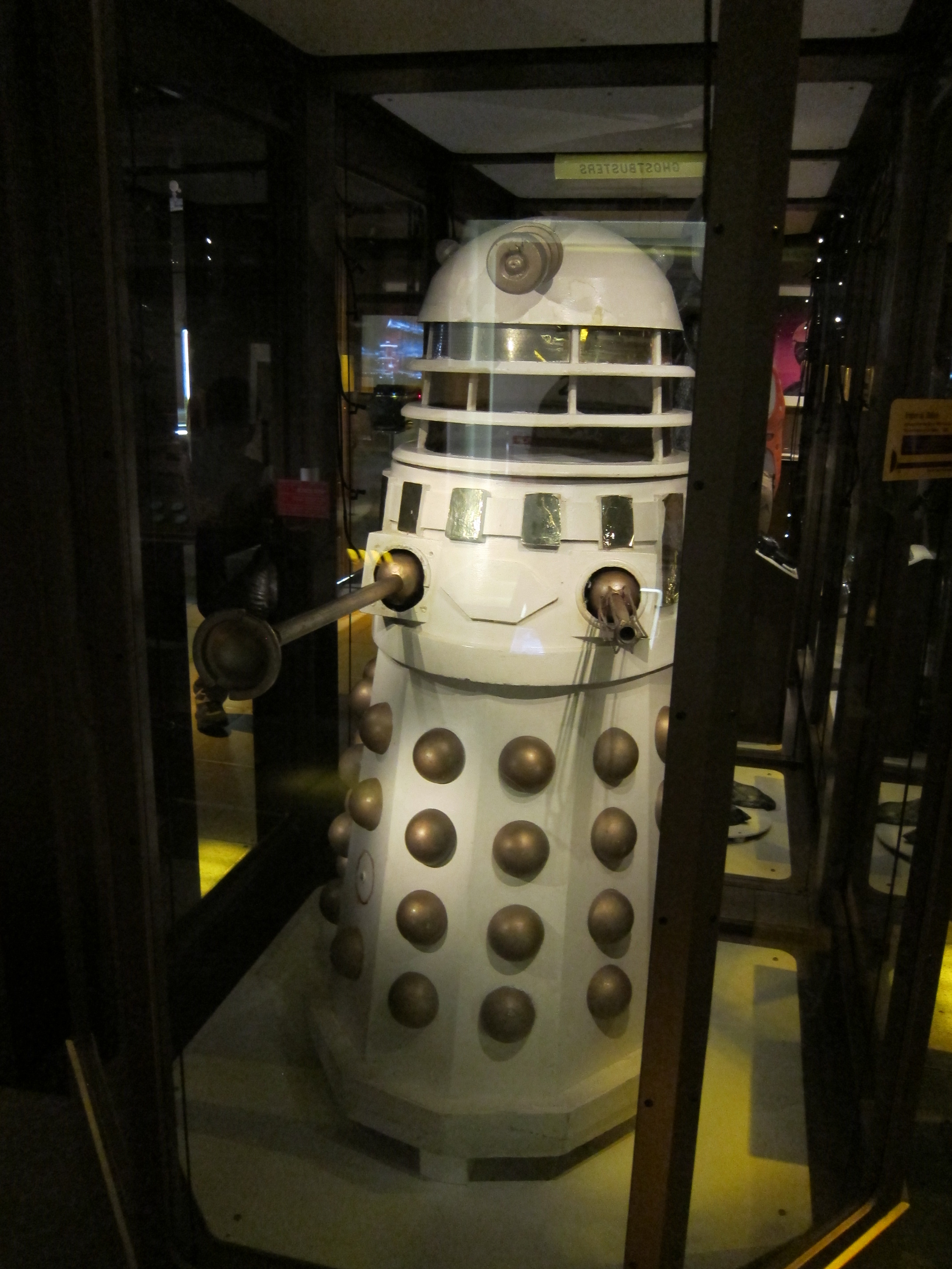 In a more sci-fi themed area, there is a Dalek and Cyberman from Dr. Who, a proton pack and trap from Ghostbusters, and robes and a Bat’leth from the Klingon Empire. There’s also the gleaming metallic skeleton of a Terminator without its flesh covering. There are model ships from different movies, and a case full of blasters, lasers, and other sidearms.
