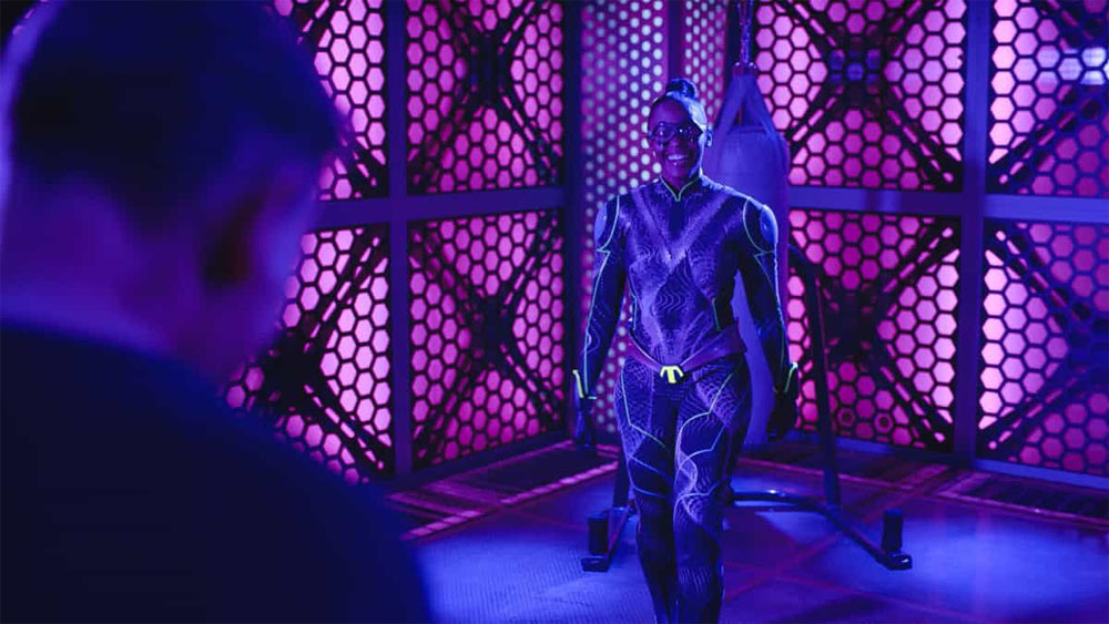Chief Lopez still hasn’t given up on her obsession with Lightning (I’d still love to hear the motivation behind this, unless she’s in Whale’s pocket, too), and has a tech monitoring social media for her. Shakur hears the alert and manages to shoot Black Lightning a warning. In the Sanctum, Anissa is working out on the heavy bag. Judging from what we see, Nafessa Williams, who plays the character, has no martial arts or boxing background at all. Gambi shows up with the newest version of her Thunder costume, and we see a few new features built into it demonstrated, although Gambi is quite a bit more reckless than usual in the process.