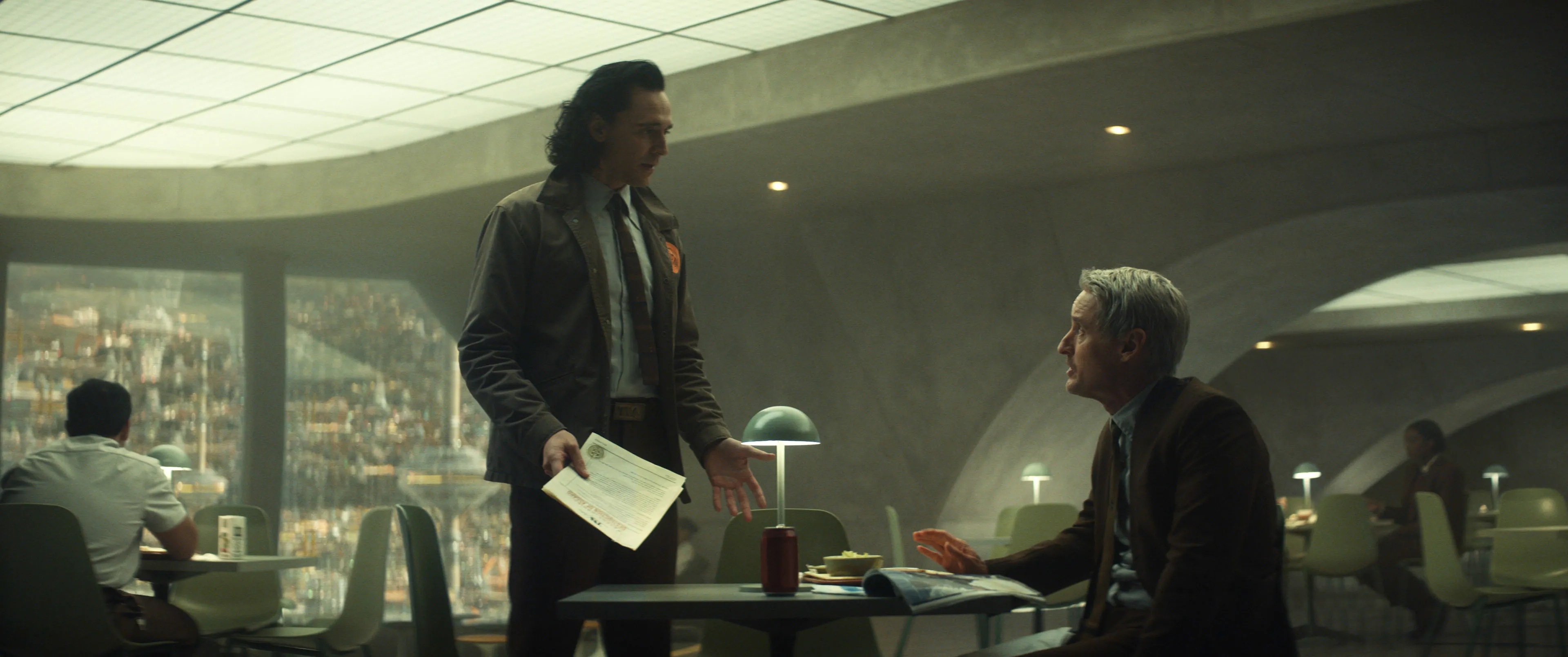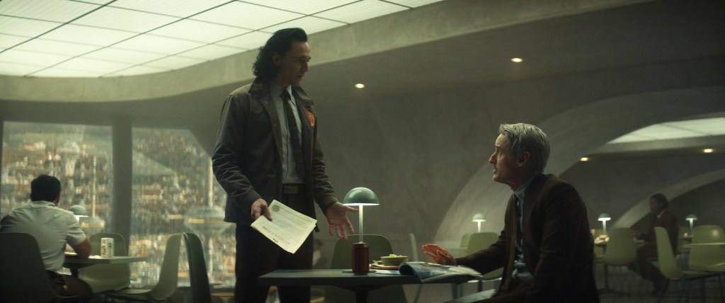 Left unattended for a time, Loki wanders off and tries to get information that will help him. Instead, after jumping through a few petty bureaucratic hoops, he ends up learning some very surprising things that stun him. Loki is finding out that he was a lot happier not knowing about his future. Finally inspired, Loki brings Mobius a theory that seems outlandish, but actually makes a lot of sense. Loki’s metaphor ends up destroying Mobius’ lunch, and parts of Casey’s as well, but he finally gets his point across. Reluctantly, Mobius listens and agrees to a field test, although not the one Loki asked for. There’s a good bit about back-stabbing that’s been played in most of the trailers, and then Loki proves his theory to a surprised Mobius. This leads to a new line of investigation and some more fun exchanges between Loki and Mobius. They talk about free will, the nature of reality, and Loki’s favorite subject, Loki.
