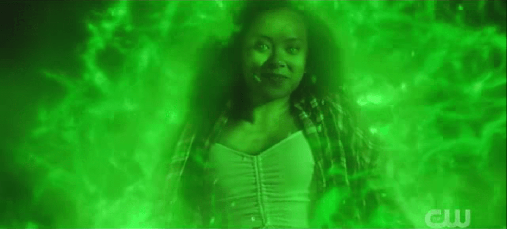 Last episode ended with a big fight between Courtney and Jennie-Lynn Hayden, AKA Jade, the daughter of the original, Golden Age Green Lantern. Now, there’s wreckage all over and explanations to be made. Also, it seems Courtney’s staff and Jennie’s ring don’t get on, and Courtney has a brief moment of playing disciplinarian that’s fun to watch. Jennie is very nice and apologetic, while Courtney is stand-offish, suspicious, and accusatory. She’s really got the teenager with a chip on their shoulder thing down. Introductions are made, and Jennie is stunned to meet Pat. She knows a lot about Stripesy, and I’m really curious about this. If she’s been in an orphanage for so long, how’d she hear about him? If she was with Alan Scott, the Green Lantern, how’d she wind up in the orphanage? Scott didn’t think to make provisions for his kids with his life being so dangerous? At any rate, Courtney gets moved to the couch, Jennie gets Courtney’s room, and we see both what Jennie’s looking for and that there’s a link between her and the lantern.