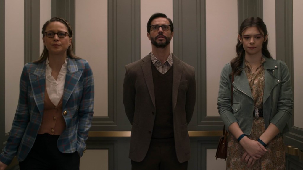 In an ill-conceived plan, they bring Zor-El to CatCo, and follow the tradition of “glasses make the secret identity.” I’m not sure why they’re bothering, since Zor hasn’t really appeared in public at all and isn’t a well-known figure on Earth, but hey, I guess it’s the rule. The cover story is that he’s “Uncle Archie from Midvale.” In a remarkable lack of planning, Nia doesn’t tell Kara the cover story to explain Kara being gone so long until they’re in the elevator on the way up. Andrea is, at first, glad to see her wandering reporter home, but a lot less so when she hears that Kara’s not bringing a big story back with her. Andrea goes in a rant to the office about being eighth in the ratings for news sources, and is really not happy about this. Big meeting over, Kara catches up with William, and finds he, too, has moved on in the time she’s been gone, dating a doctor. Kara is not having a great return to Earth so far. Just to pile on, Andrea pulls her aside and demands some interviews with Supergirl. No pressure, right? This is also when Kara finds out about the Phantom attacks while she was trapped. Really, neither J’Onn nor Alex, skilled leaders that they are, thought to give Kara a briefing about what happened while she was gone?