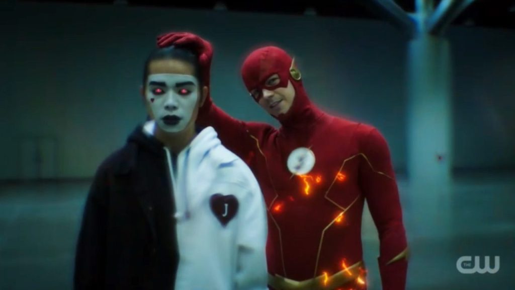 Both having had a busy day, Barry and Iris settle in for candles, pizza, and some alone time. Before you can say “That won’t last,” there’s a knock on the door, and we get this week’s guest, Ray Palmer. Ray gives a rough synopsis of what he and his wife have been up to since they left the Legends (a move very unpopular with many fans and with Brandon Routh, who plays Ray). As a bit of awkwardness about unexpected (but not uninvited, Ray is far too nice for that) guests plays out, a new version of the Royal Flush Gang attacks Mercury Labs. They have some new abilities, one fewer member, and easily get what they came for in a heist that mostly demonstrates what they can do and their fondness for card-related puns. The Royal Flash Gang are a staple in the comics, occasionally in cartoons, and have appeared on both Arrow and Flash in past seasons. Mercury Labs has also been on the Flash series before.