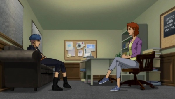 As Kal parts from Nameless Girl, Megan keeps patiently working with Harper. Harper’s problem is a serious one, and they give it some good time and justice here. After a lot of struggle and some snark, Victor’s condition finally takes a turn for the better, and Metron eventually leaves in a huff. Violet’s side quest comes to a decent ending, with a nice outcome for at least some of her efforts. The ending does a bunch of freeze frame moments, with Violet returning to the team, Victor recovering, and Megan getting Harper some desperately needed help. Tara makes a phone call that is giving me the impression they’re about to veer away from the original Judas Contract story, and they end the episode with a PSA about domestic violence, which I’m glad they did.