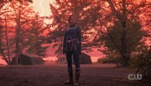 At STAR, Iris also says something you should never say in her line of work, and Barry answers some questions about the strange alternate reality he’s just returned from. This nice light moment can’t last, and doesn’t, as Iris gets word of Thawne’s visit to CCPD. Thawne rants about trying to draw out Central City’s hero, and then gets a bigger surprise as Mia Queen, Green Arrow from the future, shows up and attacks the evil speedster. Mia actually isn’t after him, and is apparently following up on events from the last time we saw her. Archer versus speedster goes about like you’d think, but Barry arrives in the nick of time for Flash to send Reverse Flash staggering. Apparently, this was more or less what Thawne wanted, and he makes a big deal out of asking for something surprising in front of witnesses.